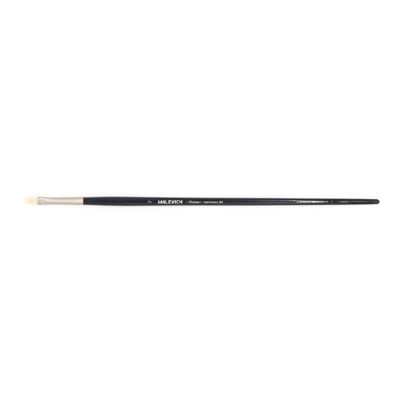 Кисть из синтетики Tician, плоская №7. Кисть из серии Tician изготовлена из жесткой синтетики белого цвета имитирующей щетину. Этот ворс отлично подходит для густых красок таких как масло, акрил, гуашь, темпера. Кисть выполнена в благородной цветовой гамме. Матовая втулка с теплым металлическим оттенком, черный лак и лаконичная маркировка делают эту кисть не только надежным художественным инструментом, но и красивым аксессуаром. Кисть держит свою форму даже при частом использовании, ворс прочно закреплен, а втулка не расшатывается со временем. Ручка кисти длинная - 25 см. Длина ворса (выставка) короткая. Номер кисти соответствует диаметру в мм.