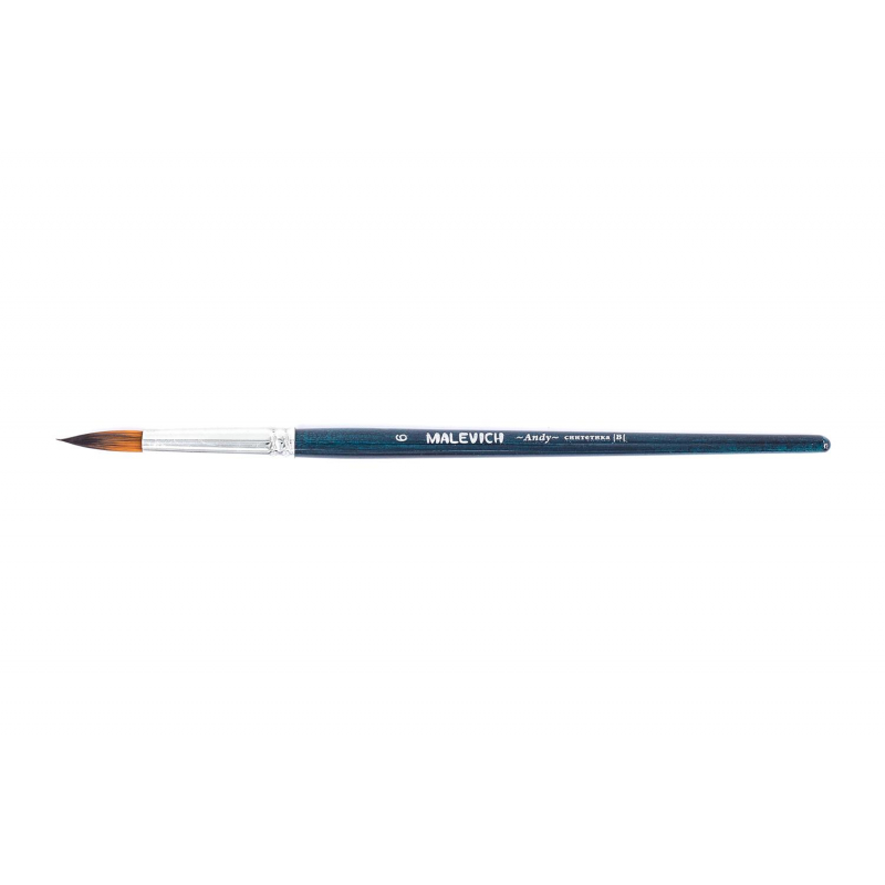 Кисть из синтетики Andy, круглая № 6. Кисть из синтетики серии Andy - это мягкая универсальная синтетика, которая подходит практически для любых видов красок. Ей удобно работать с гуашью, акварелью, акрилом, темперой. Маслом можно работать в лессировочной технике с разбавителем. Синтетика рыжего цвета с темным кончиком, ручка покрыта синим лаком, ворс закреплен втулкой из латуни с двойной обжимкой. Ручка кисти короткая - 14 см. Длина ворса (выставка) короткая. Номер кисти соответствует диаметру пучка в мм.