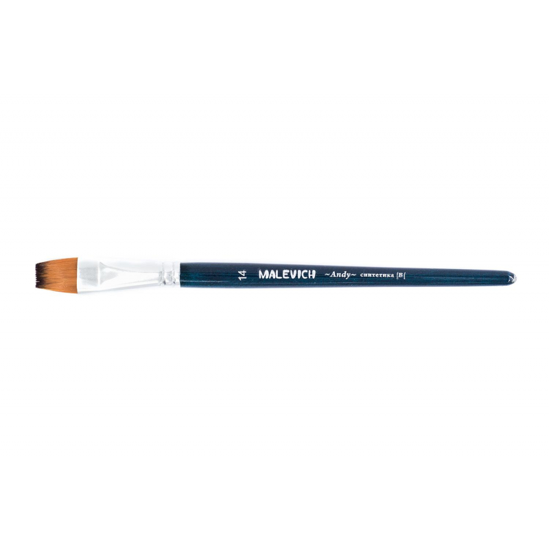 Кисть из синтетики Andy, плоская № 14. Кисть из синтетики серии Andy - это мягкая универсальная синтетика, которая подходит практически для любых видов красок. Ей удобно работать с гуашью, акварелью, акрилом, темперой. Маслом можно работать в лессировочной технике с разбавителем. Синтетика рыжего цвета с темным кончиком, ручка покрыта синим лаком, ворс закреплен втулкой из латуни с двойной обжимкой. Ручка кисти короткая - 14 см. Длина ворса (выставка) короткая. Номер кисти соответствует диаметру пучка в мм.