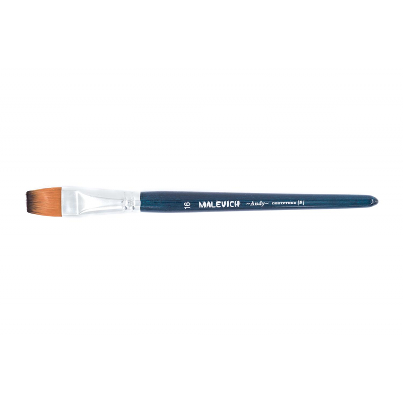 Кисть из синтетики Andy, плоская № 16. Кисть из синтетики серии Andy - это мягкая универсальная синтетика, которая подходит практически для любых видов красок. Ей удобно работать с гуашью, акварелью, акрилом, темперой. Маслом можно работать в лессировочной технике с разбавителем. Синтетика рыжего цвета с темным кончиком, ручка покрыта синим лаком, ворс закреплен втулкой из латуни с двойной обжимкой. Ручка кисти короткая - 14 см. Длина ворса (выставка) короткая. Номер кисти соответствует диаметру пучка в мм.