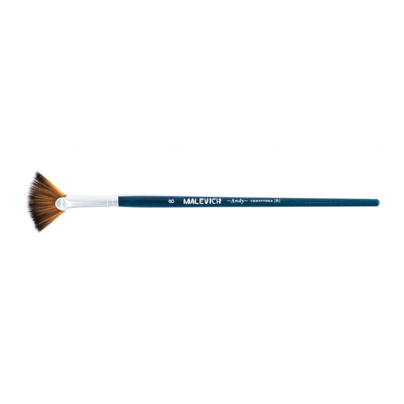 Кисть из синтетики Andy, веерная № 8. Кисть из синтетики серии Andy - это мягкая универсальная синтетика, которая подходит практически для любых видов красок. Ей удобно работать с гуашью, акварелью, акрилом, темперой. Маслом можно работать в лессировочной технике с разбавителем. Синтетика рыжего цвета с темным кончиком, ручка покрыта синим лаком, ворс закреплен втулкой из латуни с двойной обжимкой. Ручка кисти короткая - 14 см. Длина ворса (выставка) короткая. Номер кисти соответствует диаметру пучка в мм.