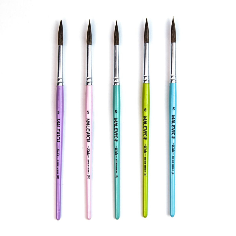Товар поставляется без возможности выбора цвета. Кисть пони (микс). Малевичъ Kids, круглая, № 5. Сочетание отличного по характеристикам волоса и красочных разноцветных ручек делает эти кисти уникальными и любимыми юными художниками. Они отлично подойдут для акварели и гуаши. Длина ворса (выставка) короткая. Номер кисти соответствует диаметру в мм.