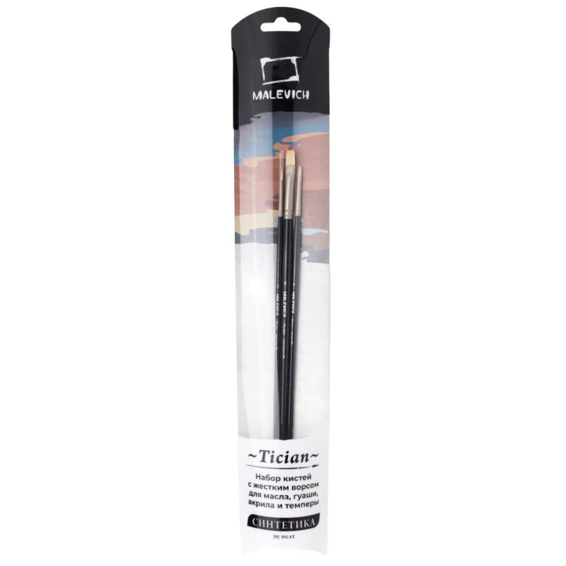 Набор кистей из синтетики Малевичъ "Тициан" (3 кисти). В наборе: круглая кисть № 2, плоские № 4, 8. Кисти серии Tician изготовлены из жесткой синтетики белого цвета имитирующей щетину. Этот ворс отлично подходит для густых красок таких как масло, акрил, гуашь, темпера. Кисти выполнены в благородной цветовой гамме. Матовая втулка с теплым металлическим оттенком, черный лак и лаконичная маркировка делают эти кисти не только надежным художественным инструментом, но и красивым аксессуаром. Кисть держит свою форму даже при частом использовании, ворс прочно закреплен, а втулка не расшатывается со временем. Ручка кисти длинная - 25 см. Длина ворса (выставка) короткая. Номер кисти соответствует диаметру в мм.
