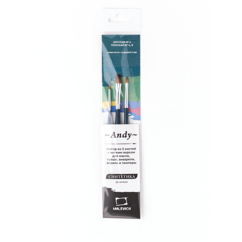 Набор кистей из синтетики Малевичъ 'Энди' (3 кисти). В наборе: круглая кисть № 2, плоские № 4, 8. Кисти из синтетики серии Andy - это мягкая универсальная синтетика, которая подходит практически для любых видов красок. Ими удобно работать с гуашью, акварелью, акрилом, темперой. Маслом можно работать в лессировочной технике с разбавителем. Синтетика рыжего цвета с темным кончиком, ручка покрыта синим лаком, ворс закреплен втулкой из латуни с двойной обжимкой. Привлекательный внешний вид и понятная маркировка для удобства покупателя. Ручка кисти короткая - 14 см. Длина ворса (выставка) короткая. Номер кисти соответствует диаметру пучка в мм.