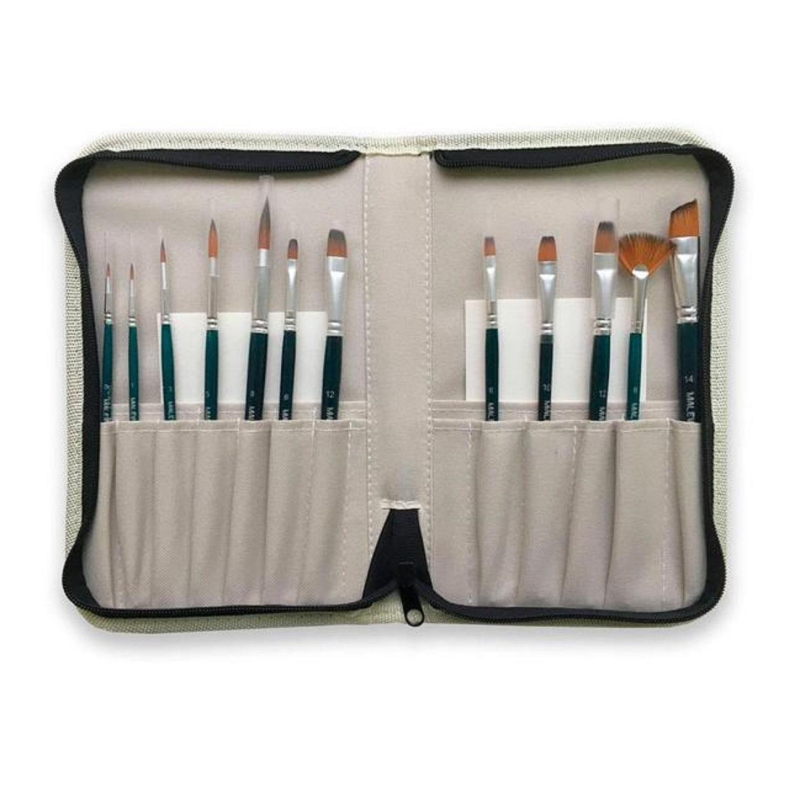 Набор кистей Andy в пенале, бежевый, 12 штук. Состав набора: пенал Малевичъ для хранения кистей размер 16x25 см, цвет - бежевый; кисти Andy (круглые - № 0, 1, 3, 5, 8; плоские - № 6, 10, 12; скошенная № 14; плоскоовальные - № 6, 12; веерная - № 8). Кисти из синтетики серии Andy - это мягкая универсальная синтетика, которая подходит практически для любых видов красок. Ими удобно работать с гуашью, акварелью, акрилом, темперой. Маслом можно работать в лессировочной технике с разбавителем. Синтетика рыжего цвета с темным кончиком, ручка покрыта синим лаком, ворс закреплен втулкой из латуни с двойной обжимкой. Привлекательный внешний вид и понятная маркировка для удобства покупателя. Ручка кисти короткая - 14 см. Длина ворса (выставка) короткая. Номер кисти соответствует диаметру пучка в мм.