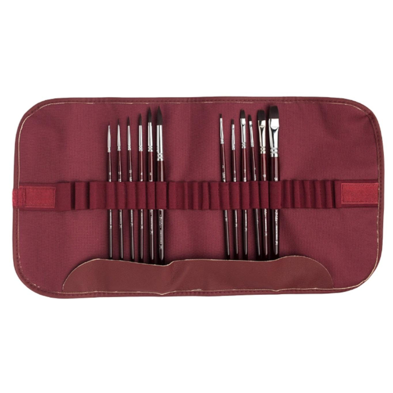 Набор кистей Frida в пенале-скрутке, бордо, 12 штук. Состав набора: пенал-скрутка Малевичъ для хранения кистей, размер 26x48 см, цвет - бордо, кисти Frida (круглые № 0, 1,5, 2,5, 4, 6, 8, плоские № 2, 3, 4, 7, 10, 14). Синтетические нейлоновые кисти Малевичъ Frida с мягким эластичным ворсом. Имеют острый кончик, который долго не стирается. Подходят для акварели и гуаши, хороши для академической техники живописи и лессировок, хорошо держат воду. По свойствам напоминают натуральную белку. Латунная обойма с антикоррозийным покрытием и двойным обжимом. Березовая ручка длиной 18 см покрыта глянцевым темно-красным лаком. Длина ворса (выставка) короткая. Номер кисти соответствует диаметру пучка в мм.