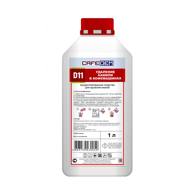 CAFEDEM D11 - концентрированное жидкое средство для удаления накипи. Предназначено для очистки оборудования от кальциевых отложений (накипи) из нагревательных элементов (в разных моделях аппаратов они могут быть представлены термоблоками, тэнами и бойлерами) кофемашин. Легкие и черные сплавы обрабатываются только после дополнительных испытаний.