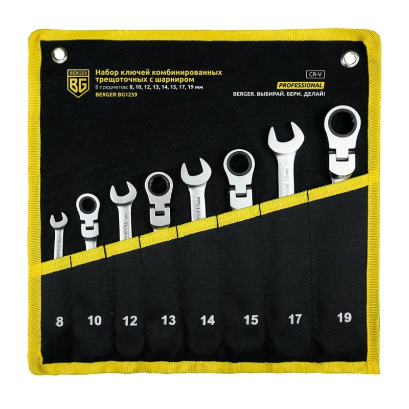 Набор ключей комбинированных трещоточных с шарниром (8 предметов) в матерчатом чехле 8, 10, 12, 13, 14, 15, 17, 19 мм. Материал: ключ полностью выполнен из прочной и качественной хром-ванадиевой стали с антикоррозийным покрытием "Сатин". Шарнир позволяет повысить функциональность ключа при работе в труднодоступных местах. Внешний вид и/или характеристики товара могут быть изменены производителем в соответствии с производственным процессом.