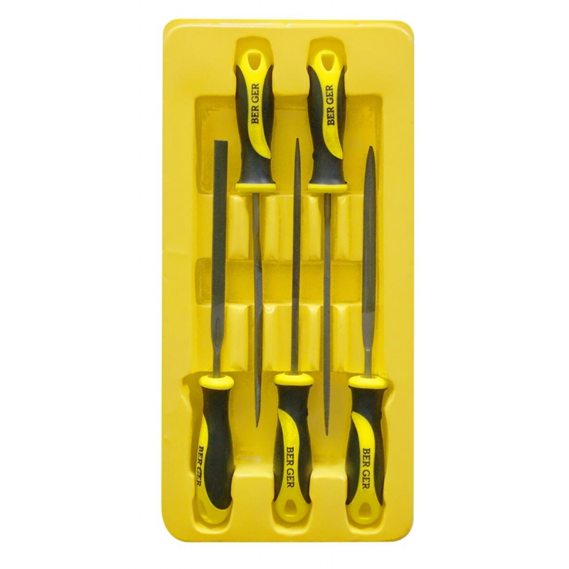 Набор надфилей 5 предметов BERGER BG1149 включает в себя ручные инструменты различных профилей для возможности качественной зачистки пазов, фасок, отверстий и кромок разнообразных конфигураций. Насечка № 2 Описание набора: 1 шт - надфиль плоский 140 мм 1 шт - надфиль полукруглый 140 мм 1 шт - надфиль круглый 140 мм 1 шт - надфиль четырехгранный 140 мм 1 шт - надфиль трехгранный 140 мм