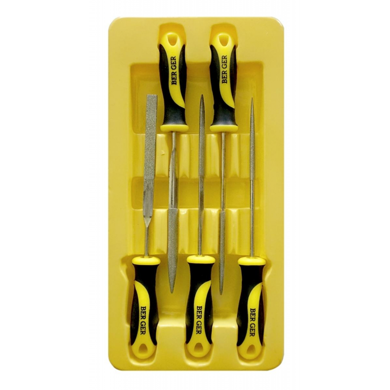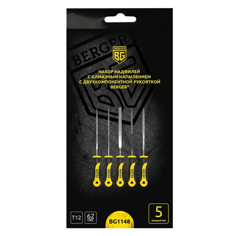 Набор надфилей с алмазным напылением 5 предметов BERGER BG1148 - инструменты для зачистки различных поверхностей, обтачивания деталей и также заострения режущих кромок инструментов. Надфили отличаются высоким рабочим ресурсом, станут прекрасными помощниками для использования в профессиональной области слесарных работ. Зернистость Р140. Описание набора: 1 шт - надфиль плоский 140 мм 1 шт - надфиль полукруглый 140 мм 1 шт - надфиль круглый 140 мм 1 шт - надфиль четырехгранный 140 мм 1 шт - надфиль трехгранный 140 мм