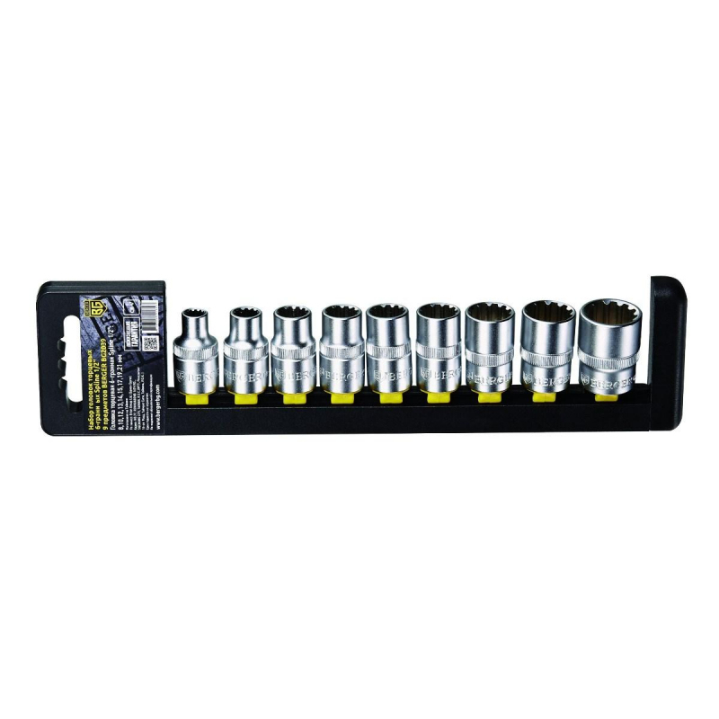 Набор головок торцевых 6-гранных Spline (профиль подходит для работы с метрическими, дюймовыми, звездочками, Е профиль, квадрат, треугольник, 12 гранным - крепежом) 1/2" 9 предметов BERGER. 9шт.-головка торцевая 6-гранная Spline 1/2": 8,10,12,13,14,15,17,19,21 мм. Выполнен из прочной и качественной хром-ванадиевой стали (CR-V). Упаковка - пластиковый держатель.