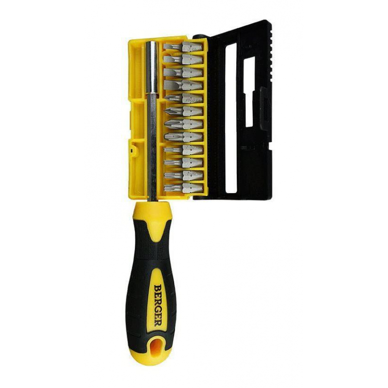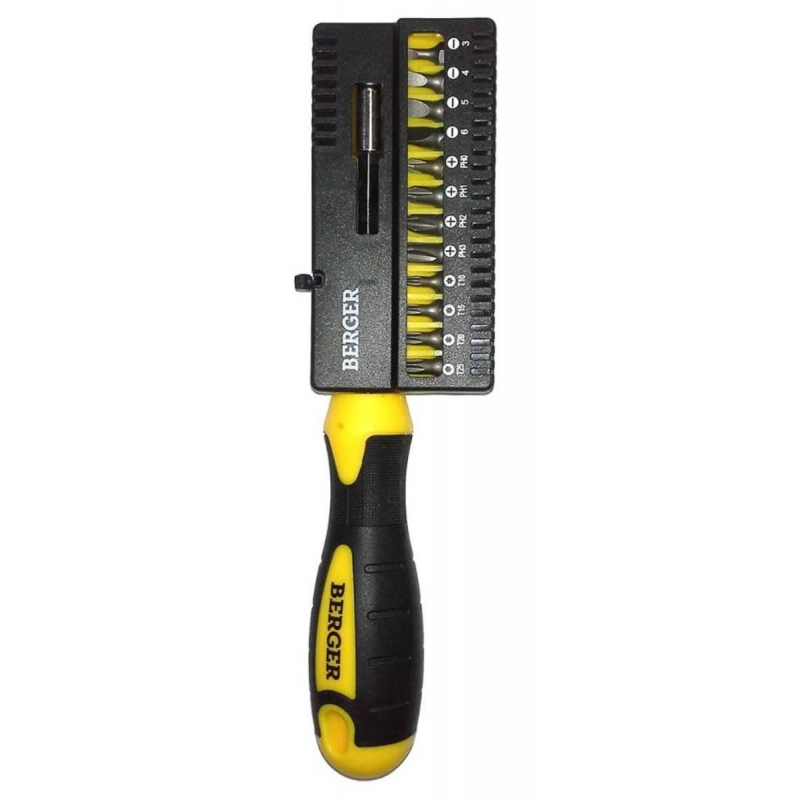 Отвертка с битами на пластиковом держателе Berger BG1072 (13 предметов) - многофункциональный комплект приспособлений для ручной работы с винтами различных профилей и размеров. Отвертка удобна в обхвате благодаря анатомической рукоятке.Комплектация:Отвертка.Биты: SL3, SL4, SL5, SL6; PH0,PH1,PH2,PH3,T10,T15,T20,T25.