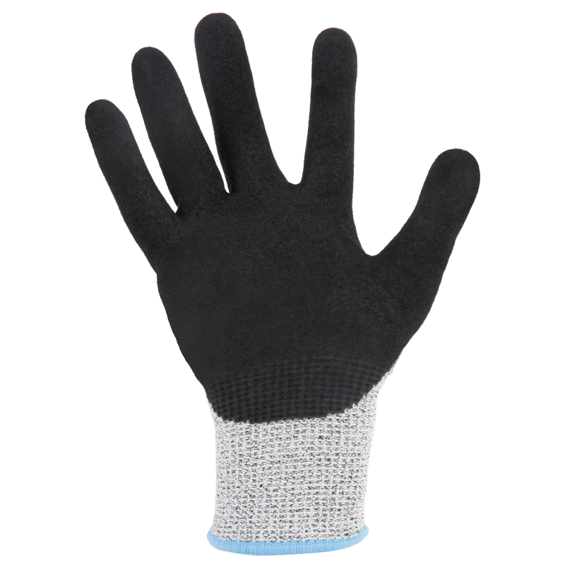 Промышленные трикотажные перчатки для защиты от порезов (5 класс) из синтетической пряжи (полиэтилен) с нитриловым покрытием ладони, цвет синий/черный, размер 10(XL). Стандарт: EN388: 4543D. Бесшовная перчатка из высокопрочных нитей полиэтилена. 13 класс вязки. Эластичная манжета для надежного удержания на запястье. Тыльная сторона ладони без покрытия - позволяет коже дышать. Нитриловое покрытие на ладони и пальцах устойчиво к работе с жирными и масляными деталями. Высокая стойкость к износу. Количество в упаковке - 1 пара. Количество упаковок в транспортном коробе - 120 пар. Сфера применения: сборочные линии, строительство и ремонт, производство пластмассы, авторемонт, работа с колющими и режущими деталями. Отрасли: строительство, жкх, общепромышленные работы. Условия рабочей среды: сухие условия.