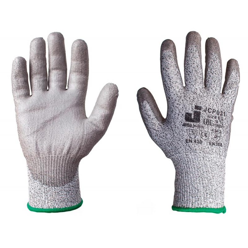 Промышленные трикотажные перчатки для защиты от порезов (3 класс) из синтетической пряжи (полиэтилен) с полиуретановым покрытием ладони, цвет серый, размер 10 (XL). Стандарт: EN388: 4343C. Бесшовная перчатка из высокопрочных нитей полиэтилена. 13 класс вязки. Эластичная манжета для надежного удержания на запястье. Тыльная сторона ладони без покрытия - позволяет коже дышать. Полиуретановое покрытие на ладони и пальцах устойчиво к работе с жирными и масляными деталями. Высокая стойкость к износу. Количество в упаковке - 1 пара. Количество упаковок в транспортном коробе - 120. Сфера применения: металлообработка, работа с абразивами, авторемонт, сборка и пусконаладка оборудования, работа с инструментом. Отрасли: строительство, жкх, общепромышленные работы. Условия рабочей среды: сухие условия.
