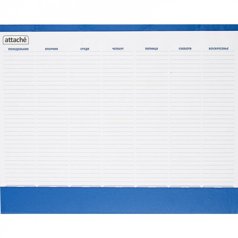 Планинг недатированный Attache. Размер: 575×450 мм. Обложка выполнена из плотного картона, который держит форму, снабжена клапаном. Включает 53 листа из высококачественной офсетной бумаги с перфорацией. На одном листе помещаются записи и даты планирующихся встреч на одну неделю. Листы из офсетной бумаги плотностью 80 гр/кв.м. Информационный справочный блок: личные данные, для заметок. Планинг поставляется в индивидуальной полиэтиленовой упаковке. Минимальный тираж под нанесение логотипа от 20 штук.