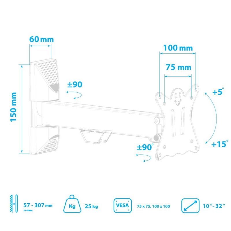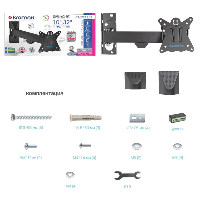 Оригинальный наклонно-поворотный кронштейн с одним дополнительным коленом CASPER-103 идеально подходит для всех LED/LCD телевизоров с диагональю экрана от 10 до 26 дюймов (25-66 см) и весом до 25 кг. Надежная стальная конструкция позволяет легко наклонять телевизор вверх-вниз под углом +5°-15° относительно стены, а также плавно поворачивать влево-вправо под углом 180°. Расстояние от стены регулируется в пределах от 57 до 307 см. Благодаря особой конструкции кронштейна, установить телевизор можно в любом труднодоступном месте, например, в углу помещения. Все соединительные кабеля проходят через специальный кабель-канал, декоративная настенная накладка закрывает металлическую часть кронштейна, что придает конструкции эстетически законченный внешний вид. Крепежные отверстия соответствуют стандартам VESA 75x75 мм и 100x100 мм. Предусмотрена удобная и простая установка, благодаря встроенному водяному уровню и съемной монтажной пластине.