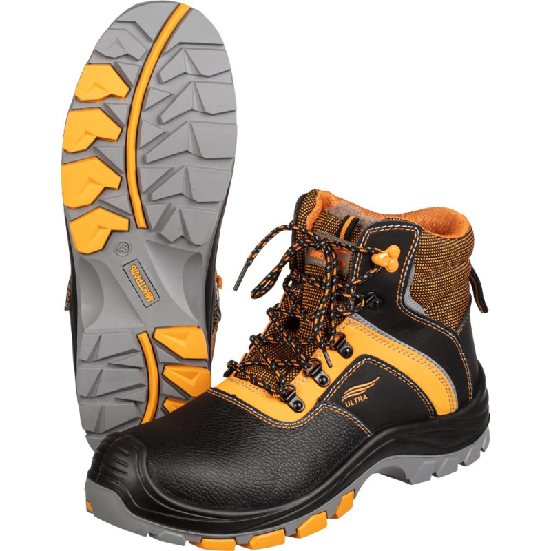 Ботинки Мистраль Ultra предназначены для работы в любой отрасли, но не предназначены для сварочных работ и работ с высококонцентрированными кислотами. Материал верха- термоустойчивая водоотталкивающая натуральная кожа (юфть) толщиной 1,8-2,0 мм. Размер 47. Вставки из микрофибры. Высота ботинка- 17 см. Подошва- двухслойная, устойчивая к воздействию нефти, нефтепродуктов, щелочей концентрации до 20%, повышенных температур. Верхний слой из полиуретана обладает амортизирующими свойствами, гасит ударные нагрузки, а также придает обуви легкость, комфортность и повышенные теплозащитные свойства. Ходовой слой изготовлен из износостойкой, термостойкой (+300°С / 60 с), морозостойкой резины на основе нитрильного каучука с улучшенным сопротивлением скольжению, стойкостью к деформациям, истиранию. Носочная часть имеет дополнительную защиту в виде полиуретановой накладки, предотвращающей механические повреждения обуви и препятствующей проникновению холода. Для защиты от ударов в носочной части стопы в обуви применяется композитный (поликарбонатный) подносок (Мун 200), имеющий конфигурацию, препятствующую надавливанию верхнего края на стопу, и оборудованный прокладкой из полиуретана. Соответствует ТР ТС 019/2011.