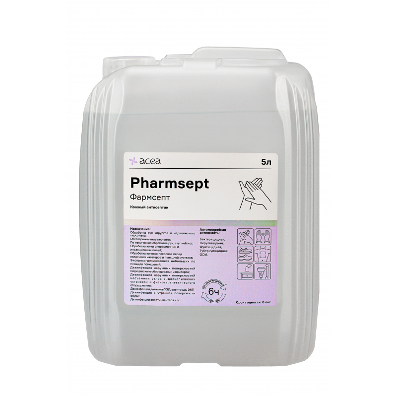 Средство дезинфицирующее 'Фармсепт' представляет собой готовую к применению прозрачную бесцветную или с цветом применяемого красителя жидкость с запахом пропиловых спиртов. В качестве действующих веществ средство содержит спирт изопропиловый (пропанол-2) - 66%, спирт пропиловый (пропанол-1)-10%, дидецилдиметиламмоний хлорид 0,125% и алкилдиметилбензиламмоний хлорид -0,125%, октенидина дигидрохлорид, а также функциональные добавки, в том числе увлажняющие компоненты. Применение: обработка рук хирургов, оперирующего медицинского персонала. Гигиеническая обработка рук медицинского персонала. Обработка кожи операционных и инъекционных полей, перед введением катетеров и пункцией суставов; кожи локтевых сгибов на доноров. Дезинфекция наружных поверхностей медицинского оборудования. . Дезинфекция изделий медицинского назначения (тонометры, рентгенкассеты, фонендоскопы, стоматологические инструменты). Обеззараживание воздуха. Средство согласно ГОСТ Р 56990-2016 обладает бактерицидной активностью в отношении грамотрицательных и грамположительных бактерий (в т.ч. в отношении возбудителей внутрибольничных и кишечных инфекций, возбудителей микобактериозов, туберкулеза - тестировано на культуре тест-штамма Mycobacterium terrae), возбудителей особо опасных инфекций - холеры, туляремии, сибирской язвы; вирулицидной активностью (в отношении вирусов полиомиелита, энтеральных и парентеральных гепатитов, герпеса, ВИЧ-инфекции, энтеровирусов Коксаки, ЕСНО, ротавирусов), фунгицидной активностью. Средство обладает пролонгированным бактерицидным действием не менее 6 часов. Не оставляет следов и разводов на поверхностях после полного высыхания, не портит обрабатываемые объекты, не обесцвечивает ткани. Средство сохраняет свои свойства после замораживания и последующего оттаивания. По параметрам острой токсичности, согласно классификации ГОСТ 12.1.007-76, средство при введении в желудок и нанесении на кожу относится к 4 классу мало опасных соединений; при парентеральном введении (в брюшную полость) относится к 5 классу практически нетоксичных веществ (по классификации К.К. Сидорова); при ингаляционном воздействии по зоне острого токсического действия средство в виде паров и аэрозоля (при соблюдении норм расхода) относится к 4 классу мало опасных соединений по Классификации степени ингаляционной опасности дезинфицирующих средств. Средство не оказывает местно-раздражающего, кожно-резорбтивного и сенсибилизирующего действия в рекомендованных режимах применения. Нанесение средства на скарифицированную кожу не осложняет заживление искусственно нанесенных ран. Средство вызывает умеренное раздражение слизистых оболочек глаз при внесении в конъюнктивальный мешок. Срок годности средства - 6 лет с даты изготовления в невскрытой упаковке изготовителя.