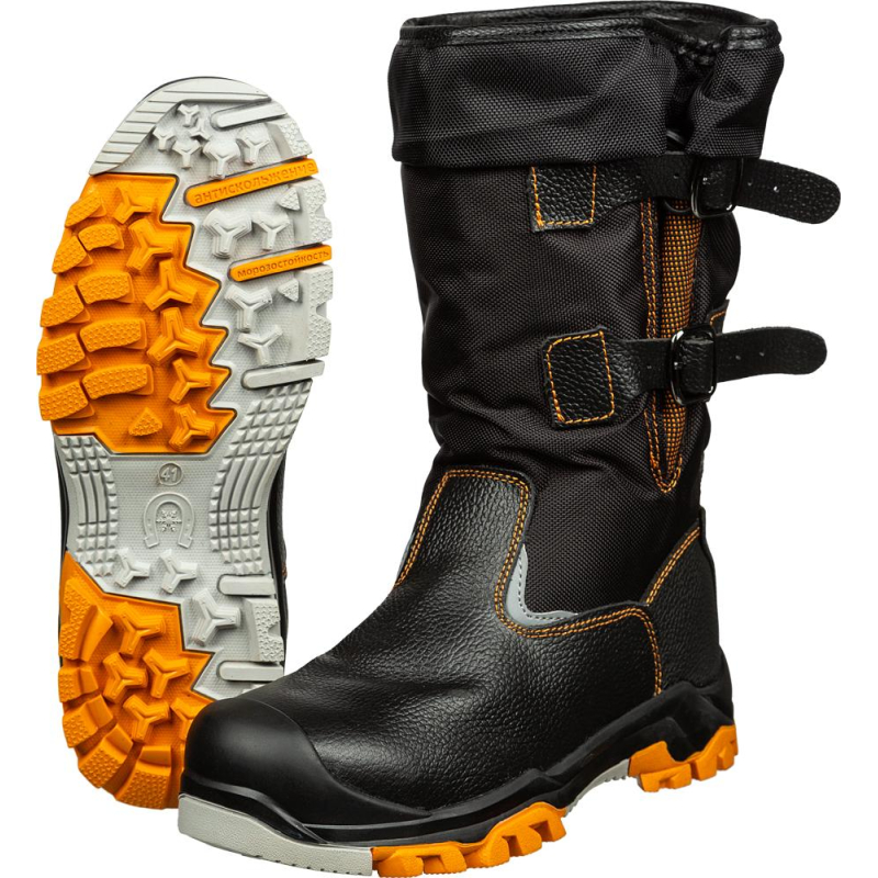 Сапоги Север выполнены из термоустойчивой водоотталкивающей кожи (юфть) толщиной 1,8-2,0 мм. Голенище - из высокопрочного водоотталкивающего текстильного материала, высокой плотности регулируемое по ширине на двух пряжках, с помощью которых обеспечивается плотное прилегание. Текстильная надставка на шнурке оснащена фиксатором. Подошва: двухслойная ПУ-Нитрил, носочная часть имеет дополнительную защиту, композитный (поликарбонатный) подносок (Мун 200). Утеплитель: многослойный утеплитель состоящий из натурального шерстяного меха (100% натуральный волос) плотностью 1000 гр/м2 и высотой ворса 15 мм, фольги, которая создает эффект термоса и позволяет отражать и сохранять тепло внутри сапога, Тинсулейт В 400 + текстильный материал Support System является эффективной системой для фиксации пятки.