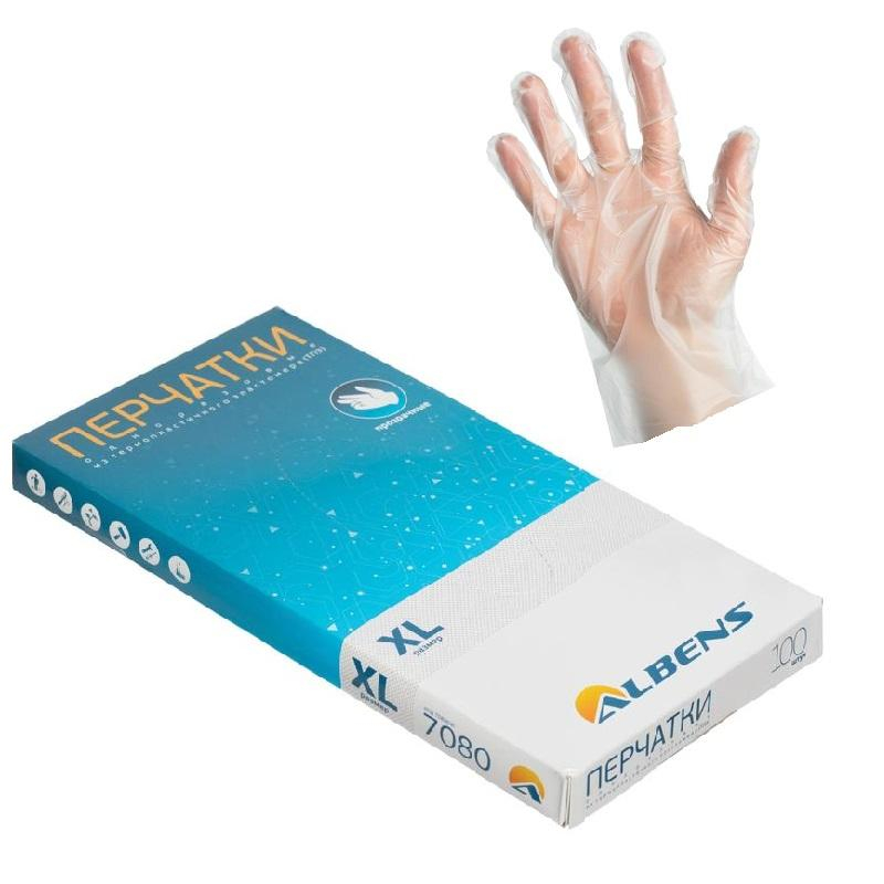 Перчатки одноразовые Albens предназначены для предприятий общественного питания, клининговых организаций, медицинских учреждений. Изготовлены из высокопрочного термопластичного эластомера (ТПЭ); надежно защищают от влаги, загрязнений, частично от химических веществ. При надевании на руку, плавно растягивая перчатку, можно сформировать мажет для более надежной посадки перчатки. Не подлежит обязательной сертификации.