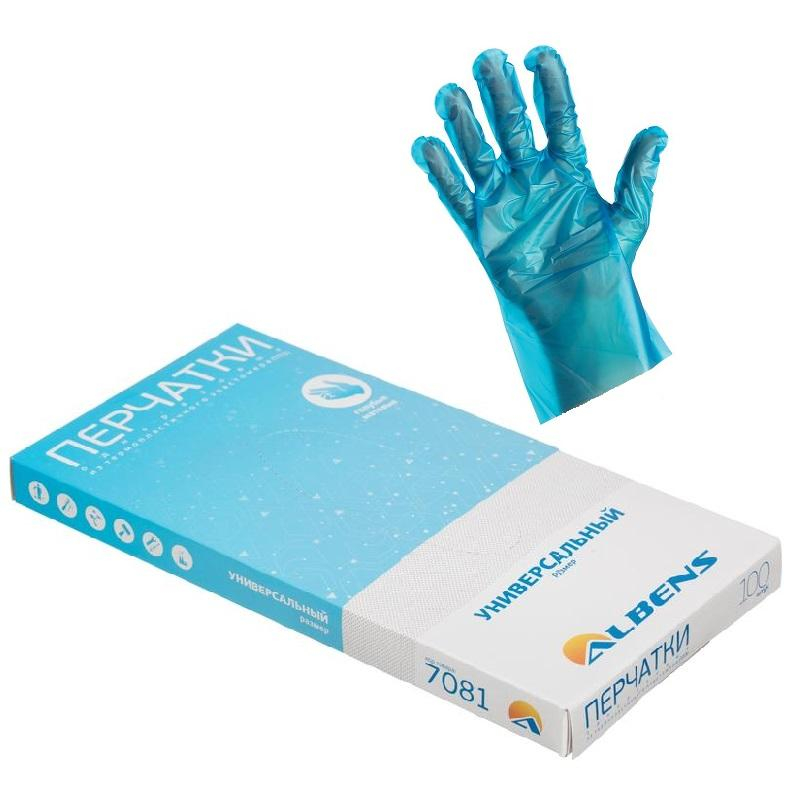 Перчатки одноразовые ТПЭ голубые,Albens (7081) унив.разм. 100 шт/упак,ПС