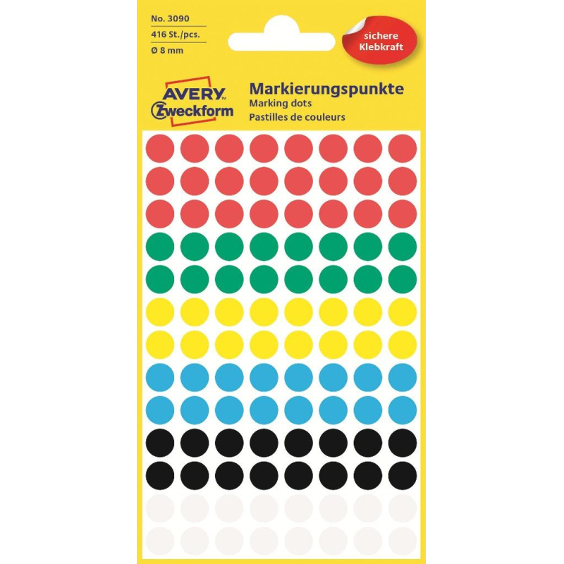 Артикул производителя: 3090. Самоклеящиеся круглые этикетки, диаметр 8 мм. Подходят для отметки цветом особых дат, событий, мероприятий в календаре, ежедневнике, различных мест на карте. Удобное выделение дней отпуска, выходных и праздничных дней, маркировка документов. Круглые этикетки-точки от Avery Zweckform - отличное решение для профессиональной маркировки в рабочем планинге, на картах. Экологичны: материал не содержит хлора и не содержит ПВХ.