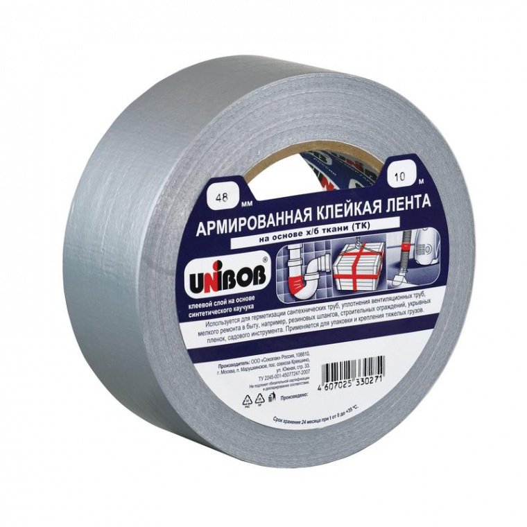 Клейкая высокопрочная армированная лента Unibob на тканево-полипропиленовой основе. Клеевой слой на основе синтетического каучука, за счет чего улучшаются клеящие характеристики ленты. Клейкая лента армирована х/б тканью, ламинированной полиэтиленом. За счет полиэтиленового покрытия обеспечивается водонепроницаемость ленты, которая позволяет применять её для герметизации швов, стыков труб и щелей, для проведения различных сантехнических и изоляционных работ с влагоконтактирующими поверхностями.
