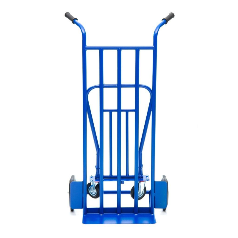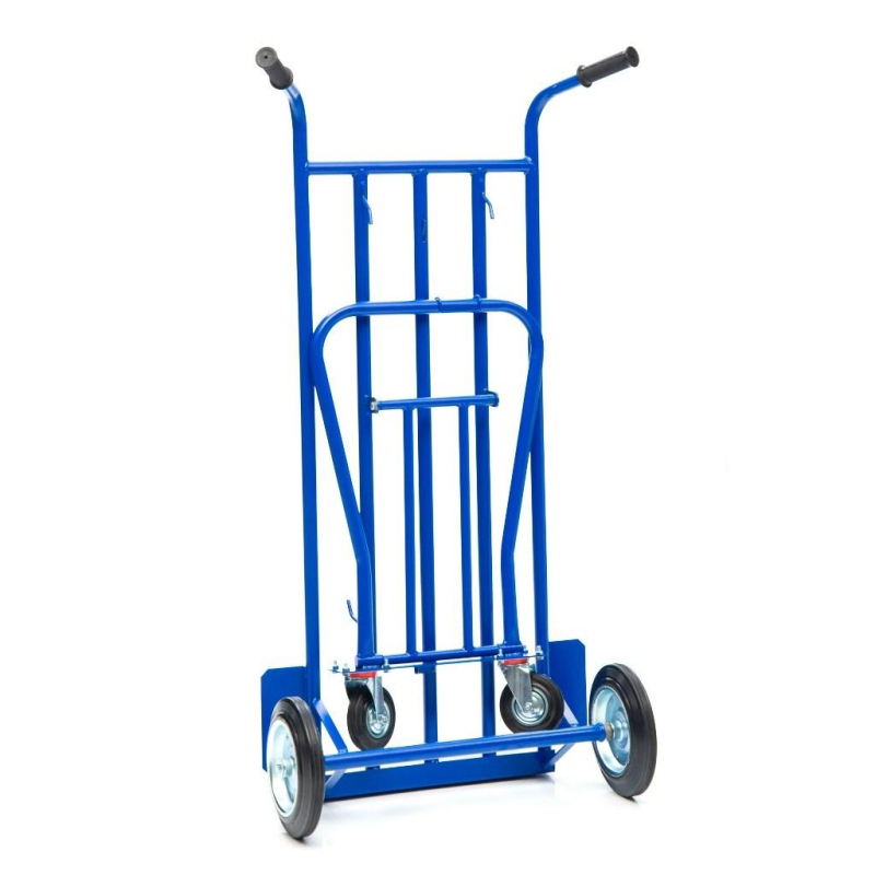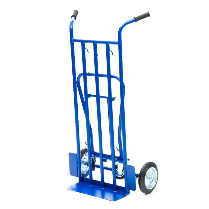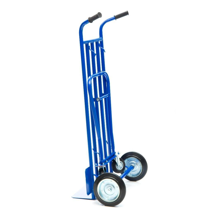 Грузовая специализированная тележка-трансформер кгК-350-И используется для перевозки различных грузов, вес которых не превышает 350 кг. Конструкция принимает три вида: 1. Горизонтальная тележка с бортом и платформой для коробок, мешков, ящиков и комбинированных товаров. 2. Наклонный вариант на трех колесах с площадкой под тяжелые штучные предметы. 3. Двухколесный вариант для перемещения и хранения модели. Размер малой платформы 500х200 мм. Размер трубчатой платформы 500х1200 мм На тележке установлены два колеса диаметром 250 мм, и два дополнительных колеса диаметром 125 мм, для опоры и маневрирования тележкой под наклоном и для работы в горизонтальном положении. Рукоятка имеет удобную для захвата форму и покрыта резиной для удобного захвата. Тележка комплектуется: метизами для крепления и промышленными колесами из черной стандартной резины, от всемирно известного, ведущего итальянского производителя Tellure Rota.