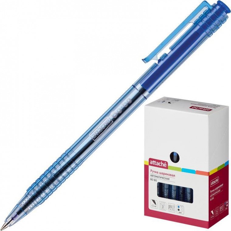 Ручка автоматическая шариковая Attache Bo-bo оснащена стержнем с синей водо- и светостойкой пастой, позволяющей писать на любых типах бумаги даже при минусовой температуре. Возвратный механизм ручки срабатывает при прижатии держателя к корпусу. Ручка Attache Bo-bo отличается мягким письмом. Толщина линии — 0,5 мм. Страна производства — Россия.