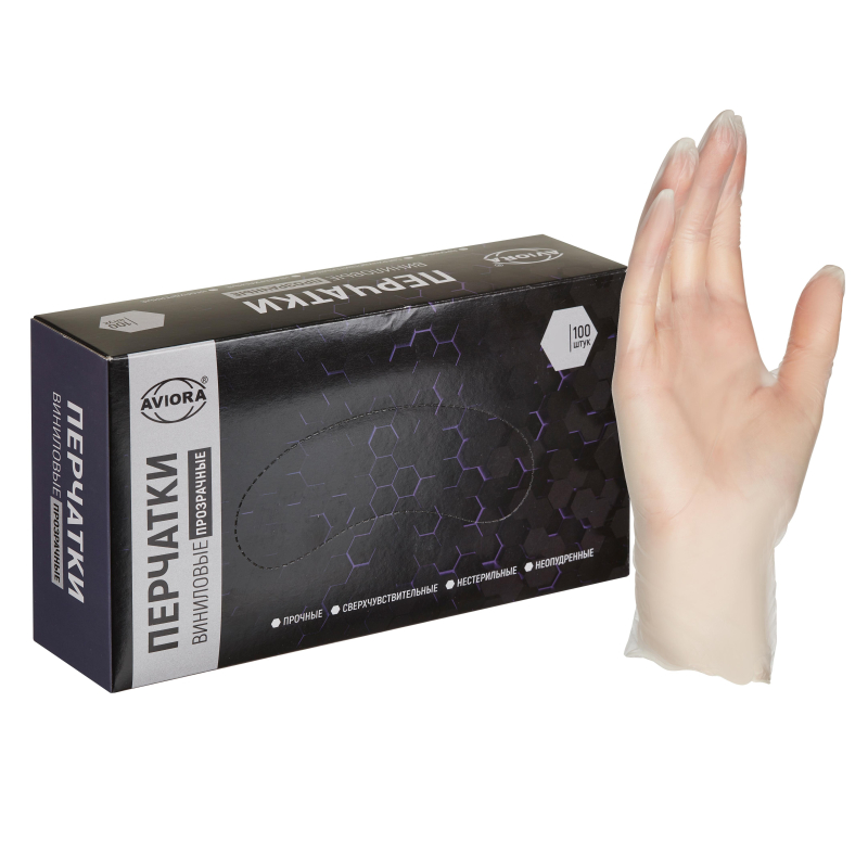 Перчатки одноразовые Aviora виниловые неопудренные, размер 7, S. Виниловые перчатки изготавливают из поливинилхлорида (синтетического материала). По сравнению с натуральными латексными перчатками они обладают меньшими аллергенными свойствами. Используются для хозяйственных работ, при проведении парикмахерских и косметологических процедур, на пищевых производствах. Количество в упаковке: 100 штук/50 пар.