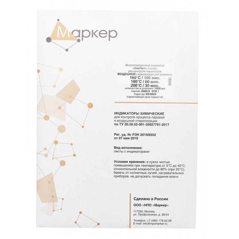 Многопеременные индикаторы "ХимТест" предназначенны для оперативного визуального контроля процесса воздушной стерилизации. Индикатор, в соответствии с классификацией по ГОСТ ISO 11140-1 относятся к 4 классу (многопеременные индикаторы). Индикаторы предназначены для контроля параметров режимов стерилизации в воздушных стерилизаторах для режимов: 160 °С/150 мин, 180 °С/60 мин, 200 °С/30 мин. Универсальный индикатор позволяет производить закладку индикатора, как в контрольные точки камеры стерилизатора, так и в индивидуальные упаковки, наборы, закладки и т.д. с изделиями. После прохождения цикла стерилизации цвет индикаторной метки необратимо изменяется на цвет эталона сравнения. Индикатор стерилизации имеет липкий слой для фиксации в месте контроля и документе архива. Срок годности: 60 месяцев. Поставляются с журналом ф. 257/у. Регистрационные удостоверения: РЗН 2019/8352 от 07 мая 2019 г., ТУ 20.59.52-001-35927791-2017.