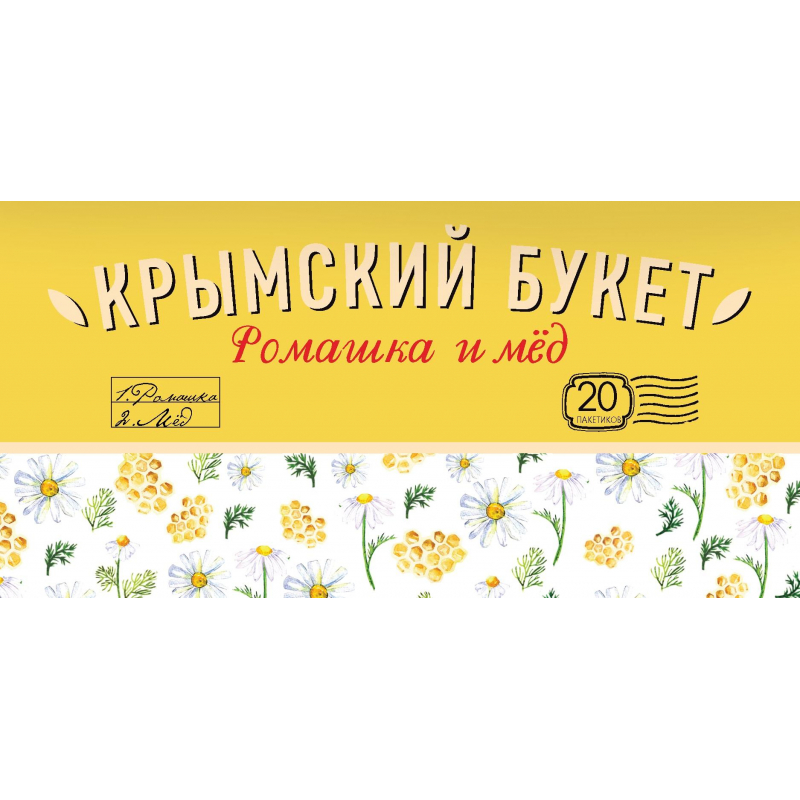 Чай подарочный Крымский букет "Ромашка и мед" пакетированный травяной 20 пакетиков. Сладковатый привкус меда идеально сочетается с цветками ромашки. Это неповторимый и полезный напиток олицетворяет летние теплые, солнечные дни. Упакован в картонную коробку с изображением ромашек и медовых сот. Способ заваривания: возьмите 1 чайный пакетик на 1 порцию. Залейте горячей водой (80-85 °C) и дайте настояться 5-10 минут. Страна производства: Россия.
