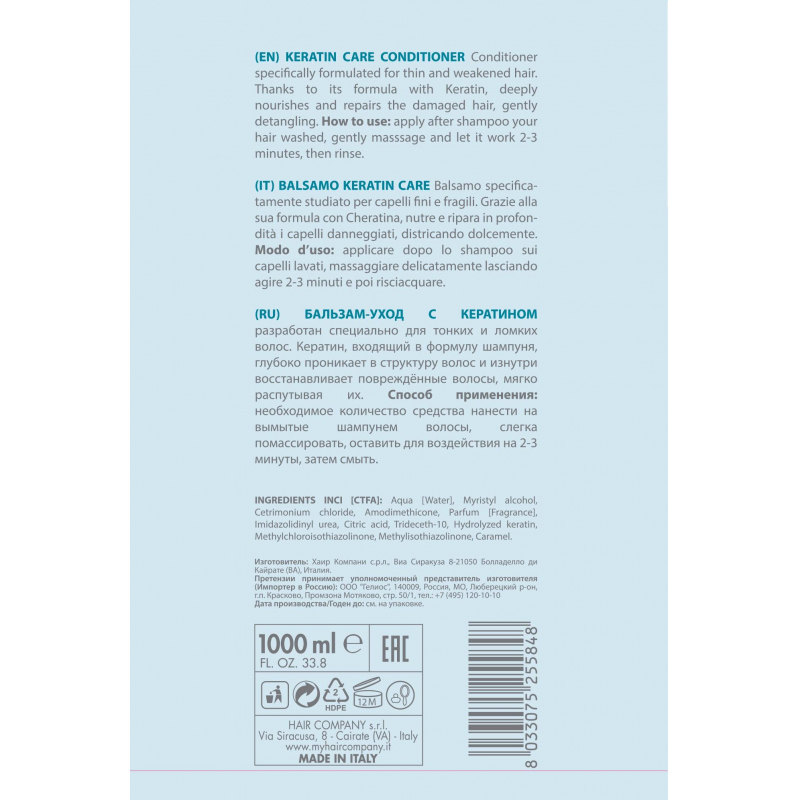 Разработан специально для тонких и ломких волос. Кератин, входящий в формулу кондиционер, глубоко проникает в структуру волос и изнутри восстанавливает поврежденные волосы, мягко распутывая их. Состав: амодиметикон, тридецет-10, кератин гидролизованный, цетримония хлорид, метилхлоризотиазолинон, имидазолидинилмочевина, карамель, парфюм, метилизотиазолинон, лимонная кислота, вода. Способ применения: нанести на вымытые шампунем и подсушенные полотенцем волосы. Тщательно распределить по всей длине. Оставить на 3-5 минут. Смыть. Объем: 1000 мл.