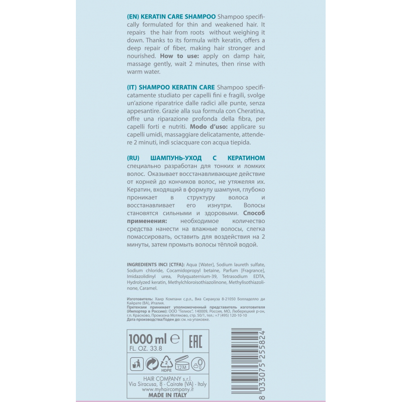 Специально разработан для тонких и ломких волос. Оказывает восстанавливающее действие от корней до кончиков волос, не утяжеляя их. Кератин, входящий в формулу шампуня, глубоко проникает в структуру волоса и восстанавливает его изнутри. Волосы становятся сильными и здоровыми. Способ применения: нанести на влажные волосы, вспенить, смыть теплой водой.