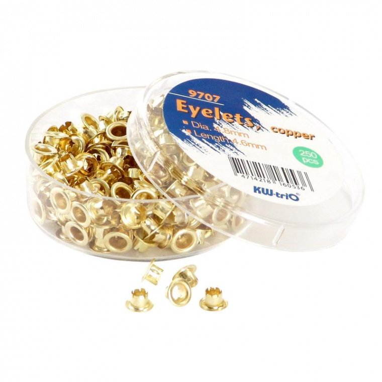 Комплект люверсов Kw-Trio для дырокола, представленный в прозрачной пластиковой упаковке. Изделия выполнены из металла золотистого цвета. Диаметр люверса — 4,8 мм, длина 4,6 мм. В упаковке содержится 250 штук. Дырокол для установки люверсов артикул 133079.