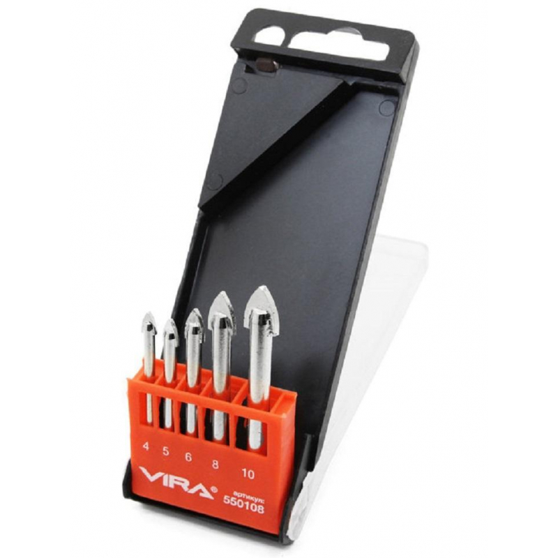 Набор сверл Vira по стеклу и керамической плитке, 5 штук, от 4 до 10 мм. Набор состоит из 5 сверл с центрированием для работы по стеклу и керамической плитке. Все сверла изготовлены из высококачественной инструментальной стали, на которую также нанесено антикоррозийное покрытие, способствующее большей износостойкости инструмента. Сверла обладают повышенной прочностью за счет специальных твердосплавных карбидных вставок. Рекомендуется работать с охлаждением.