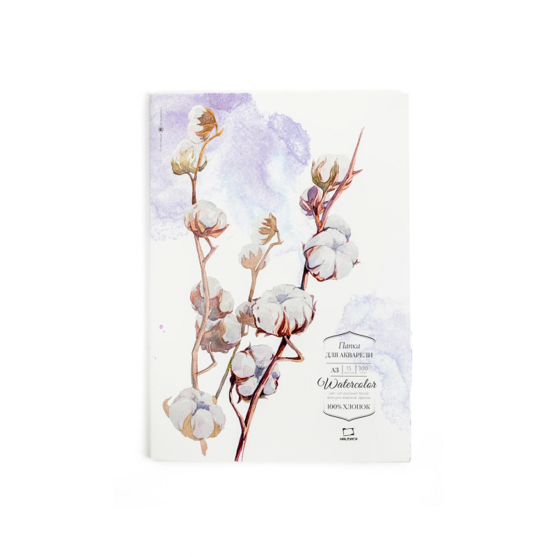 Папка для акварели Малевичъ, 100% хлопок, 300 г/м, А3, 15 л. Профессиональная бумага для акварели из 100% хлопка плотностью 300 г/м, мелкое зерно. Бумага хорошо смачивается и держит воду, при этом почти не деформируется, высыхает не быстро, позволяет работать по мокрому. На бумаге хорошо получается градиент и растяжка цвета. Во влажном состоянии хорошо вытирается и позволяет внести коррективы. Цвет впитывает не сильно, с учетом, что это хлопок.