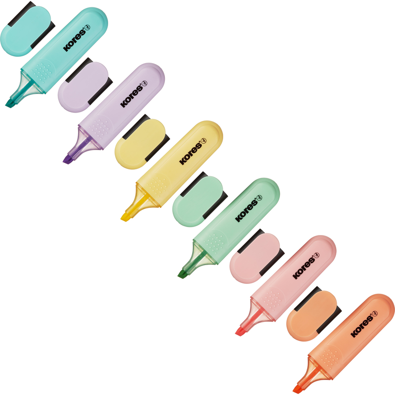 Текстовыделители Kores Bright Liner Plus со скошенным наконечником. Маркеры пастельных цветов: желтый, голубой, зеленый, розовый, оранжевый, фиолетовый. Чернила на водной основе. Предназначены для выделения текста на различных типах бумаги. Позволяют проводить линии толщиной 0,5-5 мм. Удобный пластиковый корпус. Безопасно при использовании по назначению. Хранить в сухом месте при температуре от 5 до 35 °C.