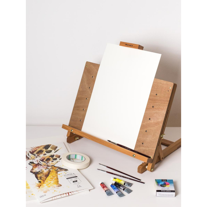 Стартовый набор для рисования акварелью. Набор подойдет любителям акварельной живописи. В составе удобный настольный мольберт с регулируемым углом наклона, который подходит для рисования на бумаге, кисти из синтетики для рисования акварелью, бумага для акварели формата А4 и А3 по 10 листов. Состав набора: настольный мольберт для акварели МЛ-14, папка для акварели Малевичъ Waterfall, 200 г/кв.м, А3, 10 листов и А4 10 листов, набор акварели Малевичъ Frida, CMYK, малярный скотч 2 см х 50 м, кисть из синтетики мягкая Frida, круглая № 2, № 3, № 6.