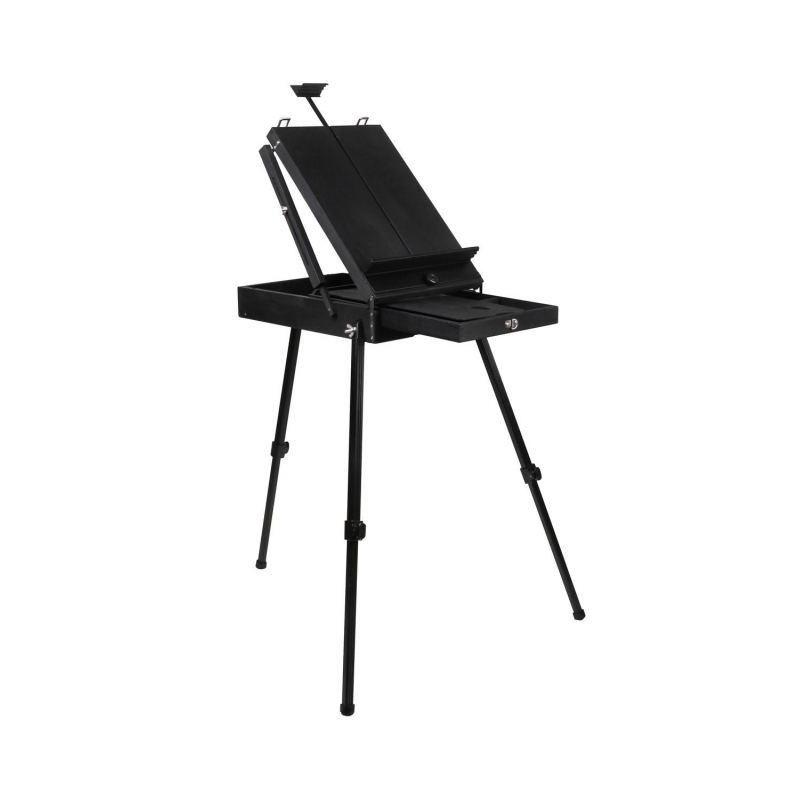Этюдный ящик МЛ-82. Современный стильный этюдник, который сочетает в себе два материала - дерево и металл. Ножки и держатели холста этюдника выполнены из алюминия, ящик сделан из сосны и затонирован в черный цвет. Благодаря такому сочетанию материалов этюдник получается невероятно легким, при этом его функциональность такая же, как и у более дорогих моделей из бука. В комплект входит палитра и ремешок для ношения на плече. Высота от 140 до 180 см. Ширина ящика 43,5 см, длина 55 см. В сложенном виде 43,5х55х12 см. Максимальная высота холста 82 см. Вес 3 кг.