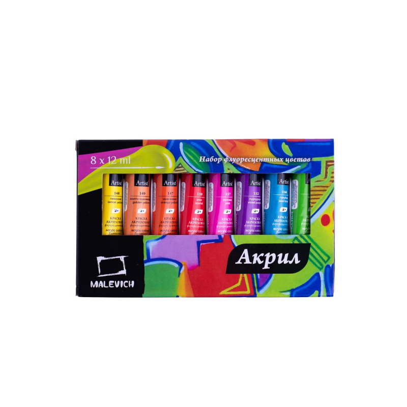 Набор флуоресцентных акриловых красок Малевичъ, 8x12 мл. Специальный выпуск для любителей яркого! Очень яркий и чистый цвет в ультрафиолете. Можно использовать свое воображение для написания картины, декорирования одежды и аксессуаров. Акриловые краски Matisso - это художественный глянцевый акрил для требовательных к качеству покупателей. В производстве используются только высококачественные светостойкие пигменты, которые обеспечивают сохранность будущего шедевра. Акрил - универсальная краска и подходит для рисования и росписи по любой поверхности. Разбавляется водой. Быстро сохнет и образует стойкую, нерастворимую пленку с глянцевым финишем. Цвета: лимонный, желто-оранжевый, оранжевый, алый, розовый, пурпурный, голубой, зеленый.