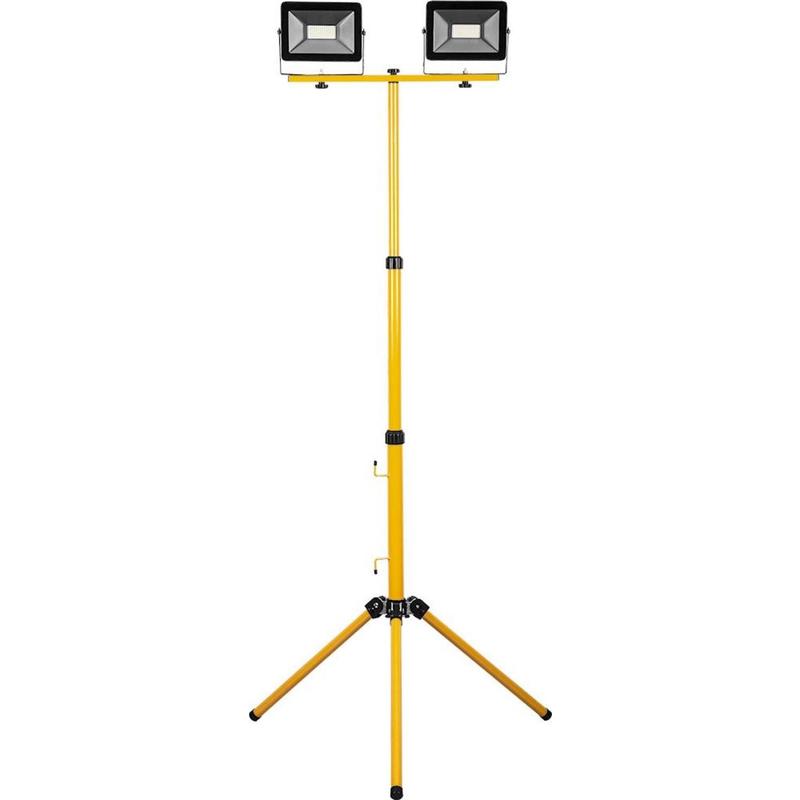 Прожектор светодиодный переносной на штативе, (ДО) FERON LL-503, 2x50W, 6400К (дневной), 230V/50Гц, 2x4500Lm, IP65, угол рассеивания 120°, 2x78LEDxSMD2835, раб.t -40°C - +45°C, цвет черный-желтый, корпус алюминий литой под давлением + стекло, 545x800x1650мм (штатив+ голова) высота штатива -1520 мм. Прожектор на штативе Feron LL-503 - осветительный прибор, состоящий из прочной и устойчивой треноги с двумя прожекторами на основе экономичных и долговечных в эксплуатации источников свечения - SMD светодиодов. Представленная модель идеальна для освещения больших площадей, например строительных объектов или спортивных стадионов и мн. др. Корпуса прожекторов выполнены из металла, имеют герметичную конструкцию.