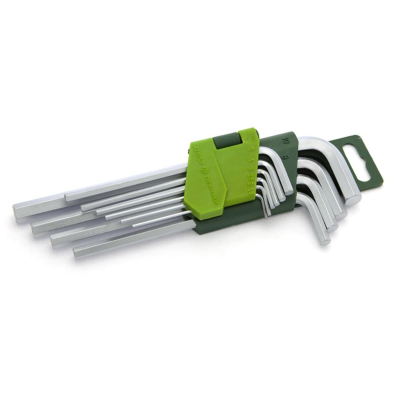 В комплектации набора учтены особенности ремонта автомобилей и монтажных работ общего назначения. Ключи угловые сочетают в своей конструкции два рычага: удлиненный для приложения максимального усилия и короткий для быстрого вращения, а также используется при работе с крепежом в условиях ограниченного пространства. Высокие прочностные характеристики позволяют избежать повреждение граней крепежа. Состав набора: - угловые ключи шестигранные: 1.5, 2, 2.5, 3, 4, 5, 6, 7, 8, 10 мм; - пластиковый холдер. Сталь: 31CrV3. Твердость: 47-52 HRC.