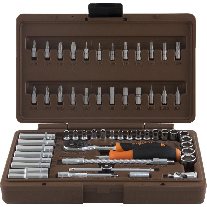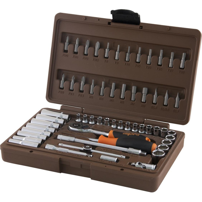 Набор инструмента автомобильный Ombra OMT57S 57 предметов инструменты, представленные в наборе Ombra, относятся к системе сборного инструмента с присоединительным квадратом 1/4DR, которая является основной при проведении работ связанных с обслуживанием изделий точной механики, электроники и бытовой техники, где рабочая зона ограничена и отсутствуют серьезные нагрузки. При производстве работ по обслуживанию автомобильной техники, благодаря небольшим размерам, набор незаменим для арматурных работ, ремонта и установки малых агрегатов и навесного оборудования двигателей. КомплектацияГоловка торцевая 13 шт. 4, 4. 5, 5, 5. 5, 6, 7, 8, 9, 10, 11, 12, 13, 14мм;Головка торцевая удлиненная 8 шт. 6, 7, 8, 9, 10, 11, 12, 13 мм;Головка торцевая E-типа (внешний TORX) 5 шт. E4, E5, E6, E7, E8;Удлинитель 75 мм;Трещоточная рукоятка;Кардан шарнирный;Вороток Т-образный;Отверточная рукоятка;Удлинитель гибкий 150 мм;Держатель для вставок-бит;Вставки-биты, набор 24 предмета: 4 PHILLIPS/КРЕСТ PH0, PH1, PH2, PH; 3 POZI/КРЕСТ PZ0, PZ1, PZ2; 8 (ЗВЕЗДОЧКА 6-гр) /TORX: T8, T9, T10, T15, T20, T25, T27, T30; 6 ШЕСТИГРАННИК/HEX: 3, 4, 5, 6, 7, 8 мм; 3 ШЛИЦ/SLOTTED: 4, 5. 5, 7 мм;Пластиковый кейс.