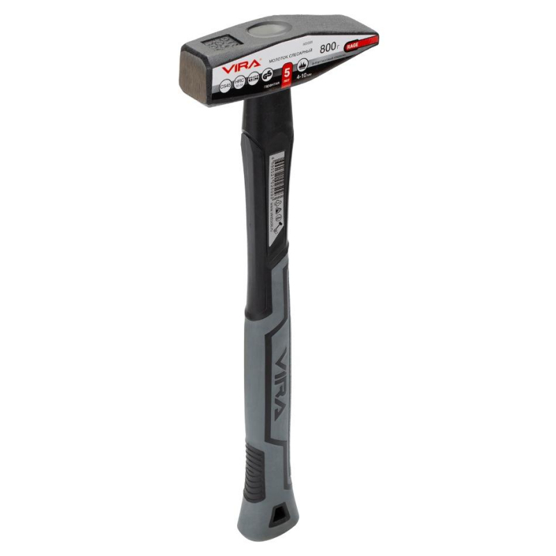 Молоток слесарный 800 г Vira с фибергласовой ручкой. Слесарный молоток служит для забивания крупных и мелких гвоздей, для сборки и демонтажа конструкций из дерева, обработки металлов. Боек выполнен из инструментальной стали CS45. Рабочая часть молотка плотно соединена с рукояткой и ощущается как ее продолжение. Эти части практически невозможно разделить. Твердость бойка: 50-54 HRC. Молоток слесарный Vira, также, соответствует немецкому стандарту DIN. Наши специалисты поработали над усилением закалки инструмента с исходных 2-6 мм до 4-10 мм. Боек стал меньше разрушаться при ударах. Рукоятка из фибергласа прочна, но легка. При использовании многократной намотки, из этого сырья изготавливают парусные мачты, автомобильные глушители и велосипедные рамы. фиберглас не рассыхается, не гниет, не реагирует на воздействие кислот. Еще одно преимущество материала - его способность гасить передающиеся удары, а значит вы меньше отобьете руки работая с металлом. Покрытие из термопластичной резины TPR мягкое наощупь и не дает рукоятке скользить в ладони. Соответствует требованиями немецкого промышленного стандарта качества Geprufte Sicherheit (GS) и стандарту качеству британского института стандартов BSI.