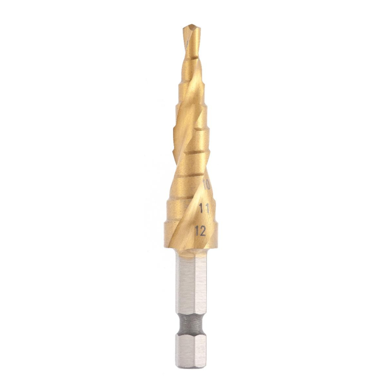 Ступенчатые cверла предназначены для сверления отверстий разных диаметров в листовых и тонкостенных изделиях из стали до 4 мм, цветных металлов, нержавеющей стали и пластика. Каждый следующий размер имеет плавный переход в виде ступеньки, что позволяет получать аккуратное отверстие нужного диаметра. Преимущества: Высокая точность - края отверстия получаются идеально ровными. Универсальность - одно сверло заменяет целый набор традиционных спиральных сверл. Комплексный подход - при сверлении отверстия есть возможность сразу снять фаску. Не требуют дополнительной подготовки (кернения, засверливания). Легкое сверление - спиральный профиль значительно облегчает сверление металла. Износостойкость - покрытие нитрид титана продлевает срок службы инструмента.
