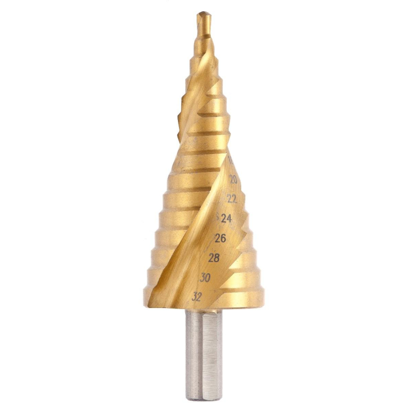 Ступенчатые cверла предназначены для сверления отверстий разных диаметров в листовых и тонкостенных изделиях из стали до 4 мм, цветных металлов, нержавеющей стали и пластика. Каждый следующий размер имеет плавный переход в виде ступеньки, что позволяет получать аккуратное отверстие нужного диаметра. Преимущества: Высокая точность - края отверстия получаются идеально ровными. Универсальность - одно сверло заменяет целый набор традиционных спиральных сверл. Комплексный подход - при сверлении отверстия есть возможность сразу снять фаску. Не требуют дополнительной подготовки (кернения, засверливания). Легкое сверление - спиральный профиль значительно облегчает сверление металла. Износостойкость - покрытие нитрид титана продлевает срок службы инструмента.
