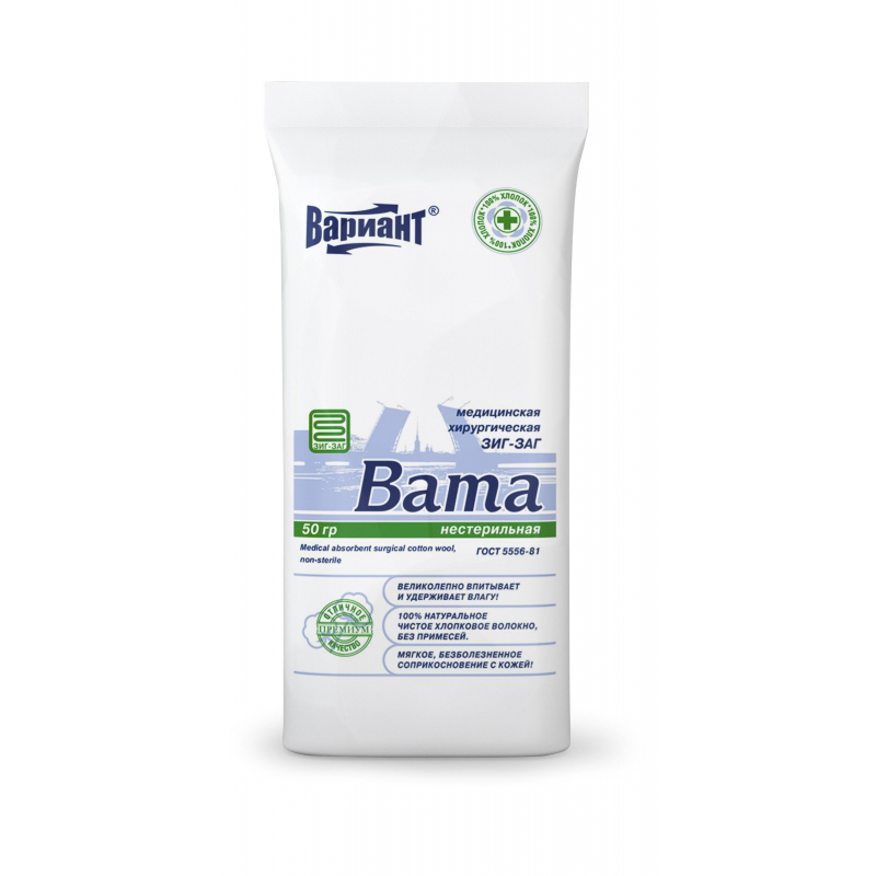 Вата может служить для утепления завязанной или забинтованной части тела (например, при согревающих компрессах), а также мягкой подкладкой при наложении шин и иммобилизующих повязок (например, гипсовых), из нее изготавливают перевязочные средства, применяют во время косметологических и косметических процедур, используют для повседневного ухода за телом. Состав: 100% хлопок, очищенный, отбеленный, с высоким содержанием длинных волокон 1-3 сорта. Отбеливание ваты производится без применения хлора. При контакте с кожей и слизистой раздражающего действия не вызывает. Имеет равномерную структуру, без посторонних включений, длинные волокна, мягкий гриф, легко распределяется на параллельные слои. Вата обладает высокой сорбционной способностью, эффективно впитывает и удерживает раневое отделяемое, хорошо смачивается как раневым экссудатом, так и растворами лекарственных препаратов. Высокая капиллярность и поглотительная способность. Отсутствие посторонних примесей, всегда нейтральная РН-среда. Срок годности 5 лет.