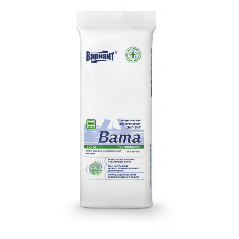 Вата может служить для утепления завязанной или забинтованной части тела (например, при согревающих компрессах), а также мягкой подкладкой при наложении шин и иммобилизующих повязок (например, гипсовых), из нее изготавливают перевязочные средства, применяют во время косметологических и косметических процедур, используют для повседневного ухода за телом. Состав: 100% хлопок, очищенный, отбеленный, с высоким содержанием длинных волокон 1-3 сорта. Отбеливание ваты производится без применения хлора. При контакте с кожей и слизистой раздражающего действия не вызывает. Имеет равномерную структуру, без посторонних включений, длинные волокна, мягкий гриф, легко распределяется на параллельные слои. Вата обладает высокой сорбционной способностью, эффективно впитывает и удерживает раневое отделяемое, хорошо смачивается как раневым экссудатом, так и растворами лекарственных препаратов. Высокая капиллярность и поглотительная способность. Отсутствие посторонних примесей, всегда нейтральная РН-среда. Срок годности 5 лет.