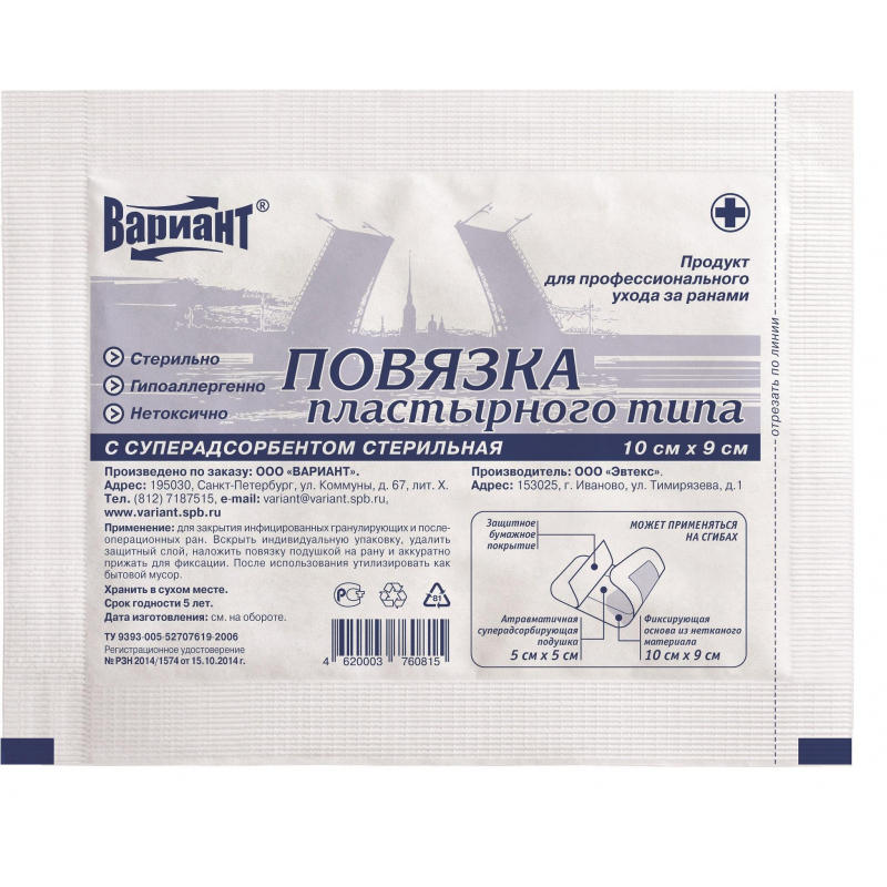 Применяется при первичной, вторичной, послеоперационной обработке ран (в том числе с нанесением мазевых составов и растворов), оказания первой медицинской помощи при незначительных повреждениях, для безопасной фиксации катетеров и дренажных трубок, подходит для применения у пациентов, как с нормальной, так и с чувствительной кожей. Состав: фиксирующая основа из нетканого полотна с гипоаллергенным акриловым клеевым слоем, впитывающая подушка из инновационного нетканого материала повышенной плотности. Стерильность и одноразовый характер использования, что создает благоприятные условия для постоянной готовности к применению, упрощает процедуру перевязки, экономит перевязочный материал, прочно фиксируются к коже, не оставляя после себя следов раздражения. Идеально повторяют естественный контур тела в месте наложения. Впитывающая подушка из инновационного материала, не содержит химических абсорбентов. Не ограничивают объема движений и не смещаются. Впитывающая способность подушки - 1300 г/кв.м. Слой подушки, контактирующий с раной, имеет атравматичную структуру и исключает вторичное травмирование раны при перевязке. Срок годности 5 лет.